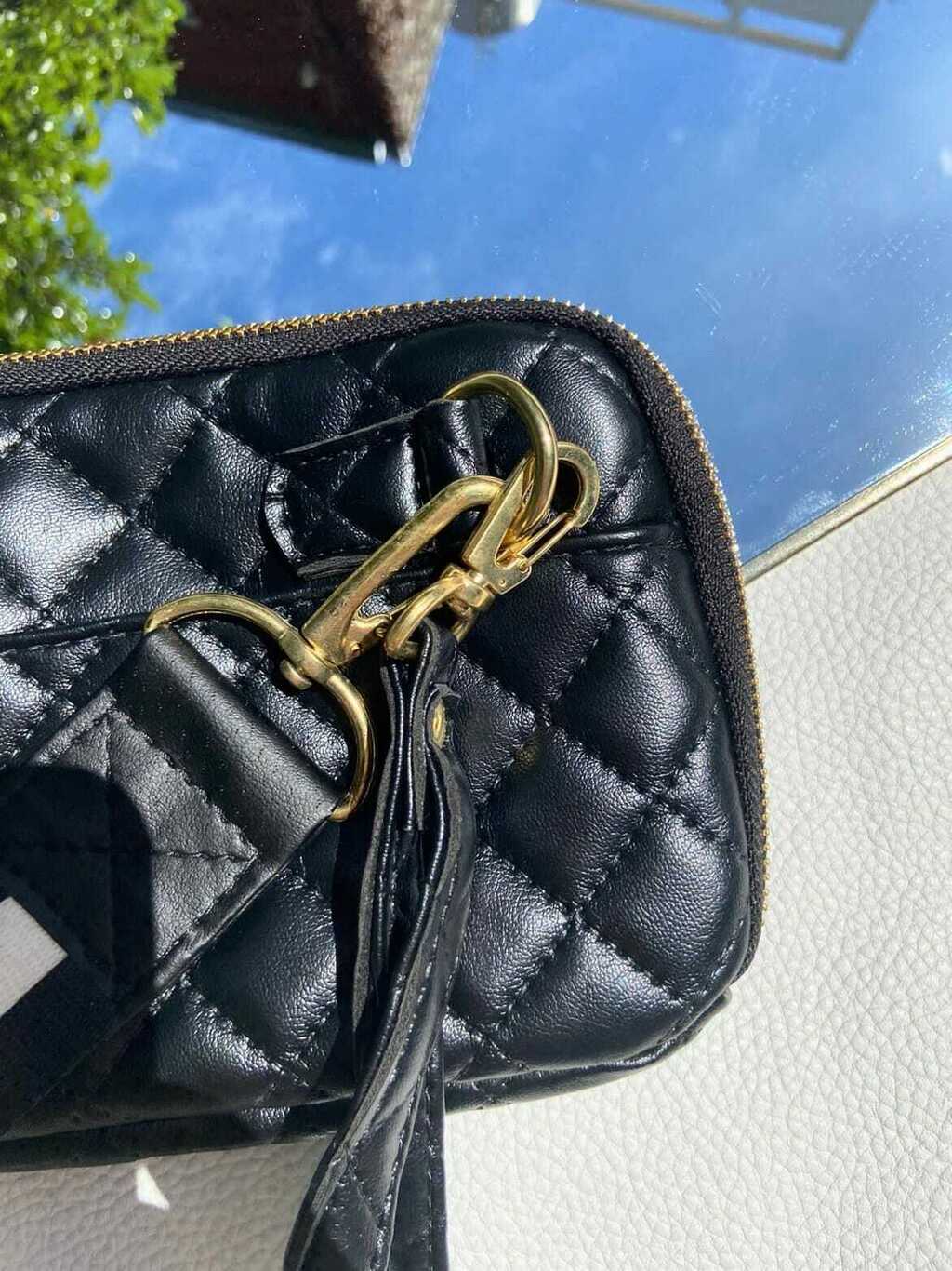 Interior forrado en color negro con monedero, multiples compartimientos y divisiones para tarjetas