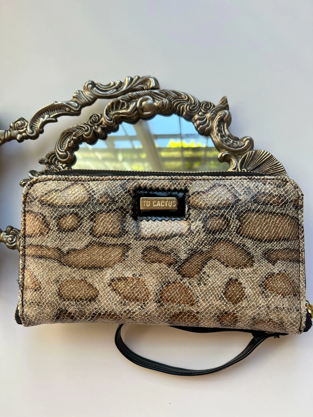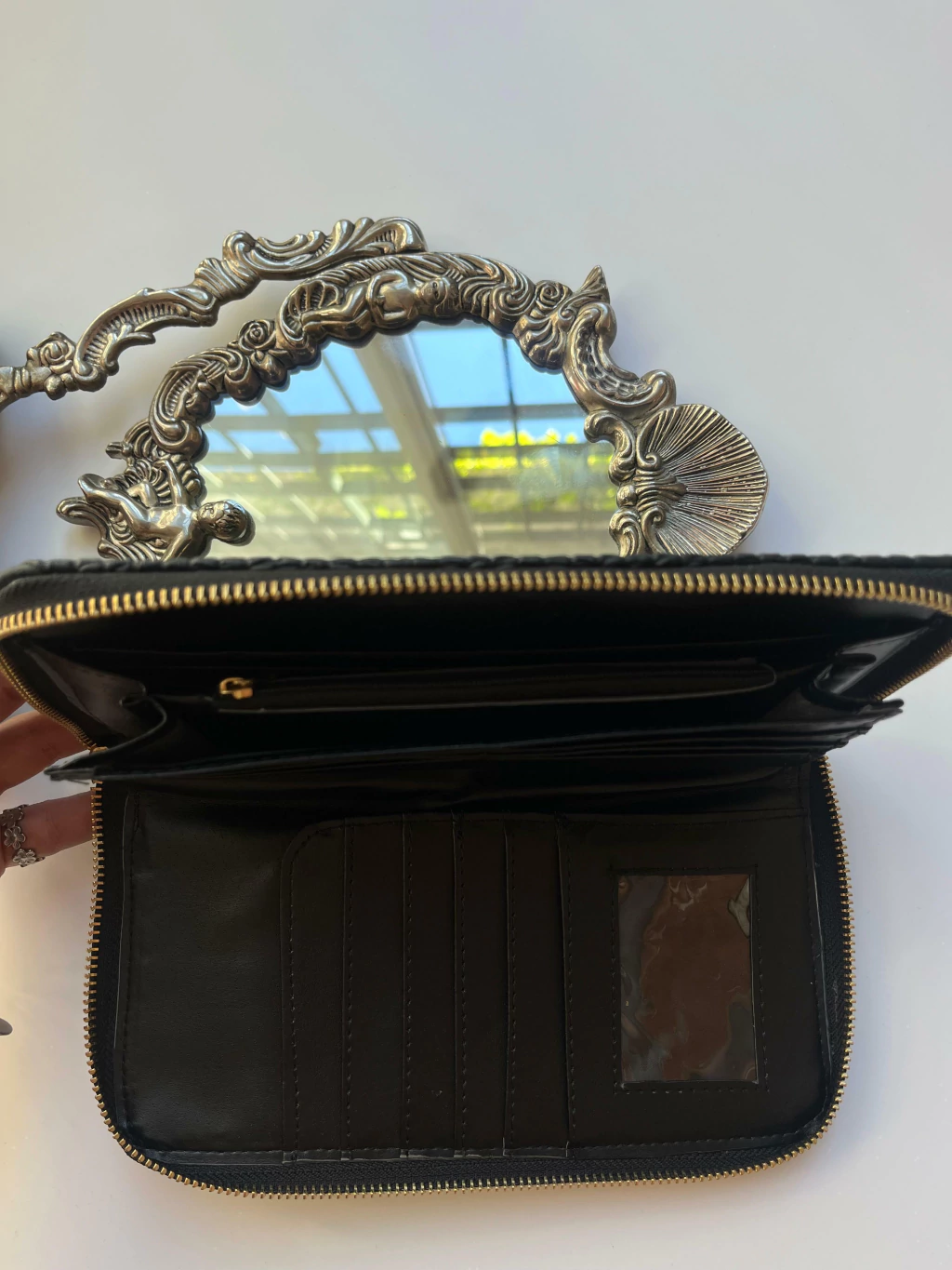 Interior con multiples compartimientos, ranuras para tarjetas y billetes