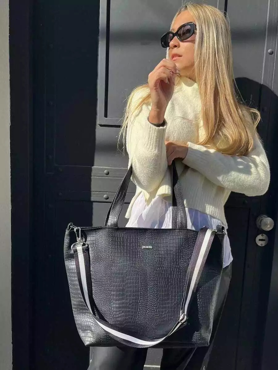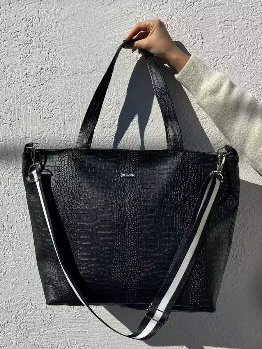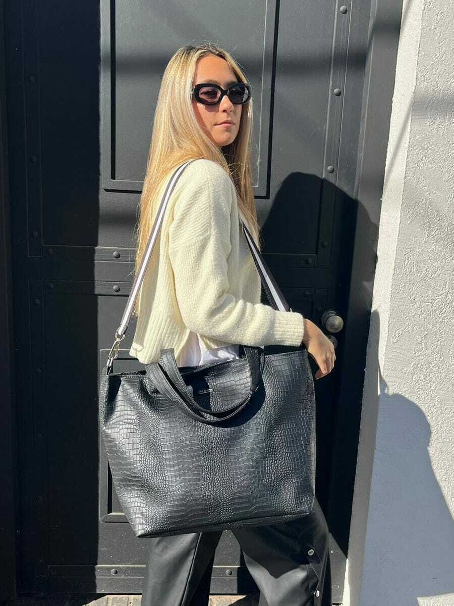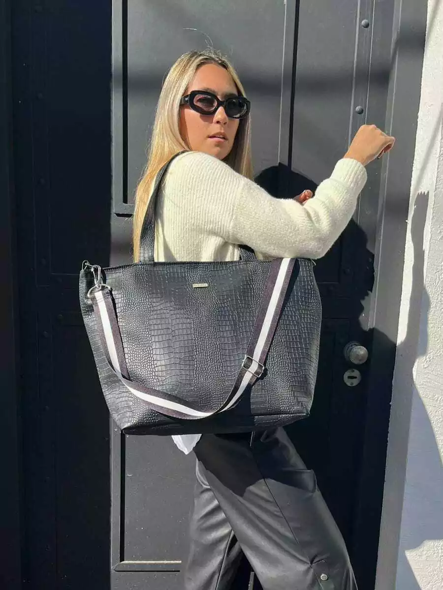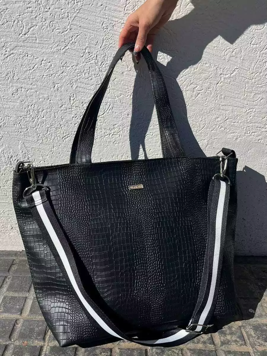 Manijas de simil cuero (0,60cm aprox) y tiras en cinta negra regulable y desmontable para transportar (1,20cm aprox)