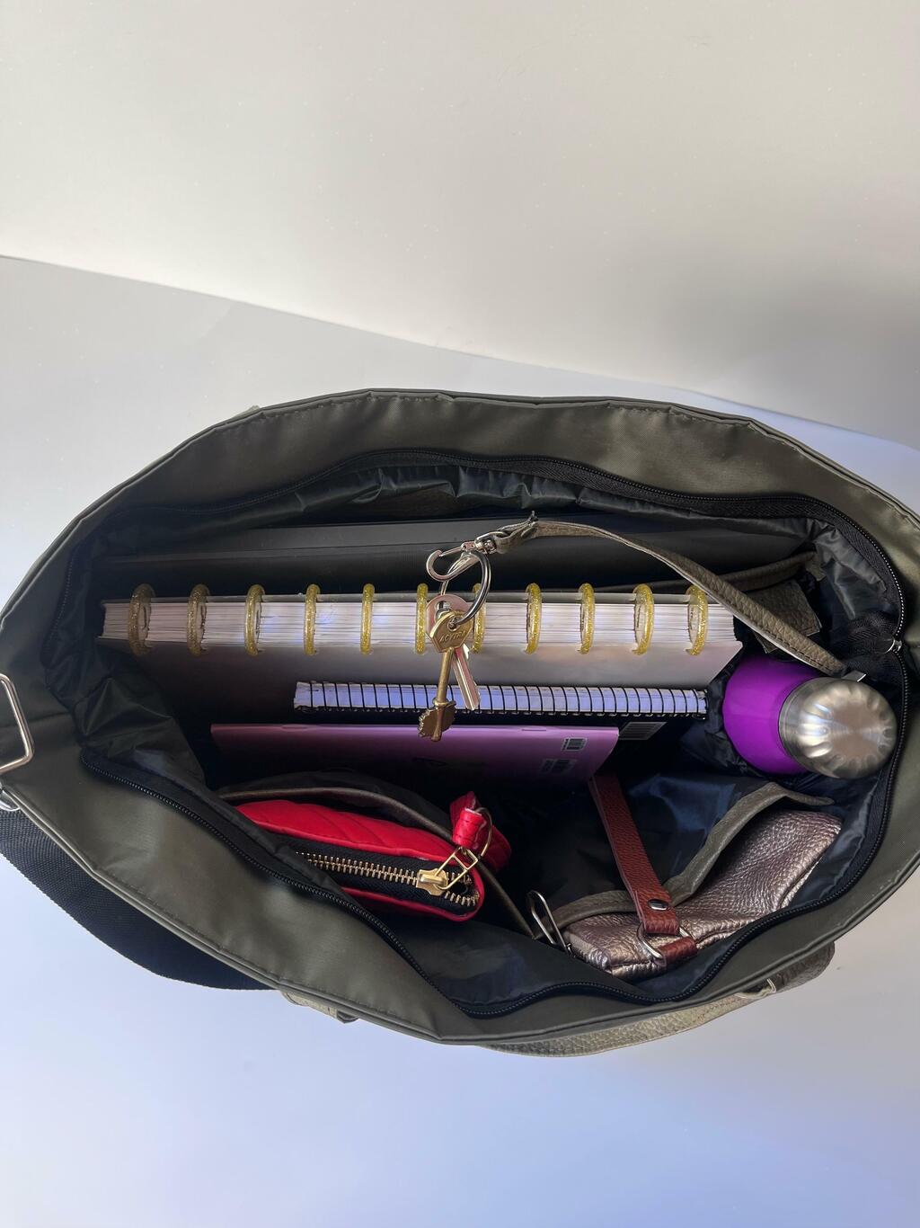 Interior amplio y forrado con bolsillos internos y portacelular,bolsillo con cierre , dos bolsillos sin cierre. portabotella , sector acolchonado para la compu,portallave